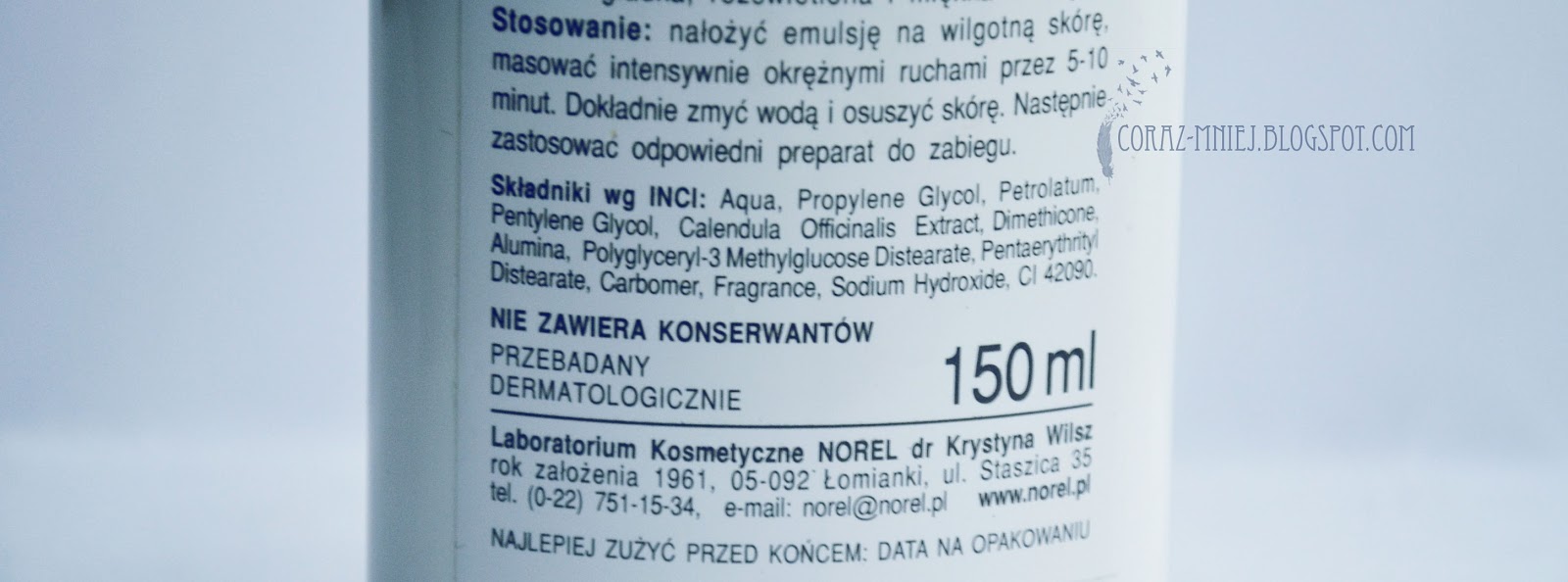 Szafirowy peeling od firmy Norel jest alternatywą mikrodermobrazji oraz jest przeznaczony dla zabiegów profesjonalnych. Co prawda, ja się na tym nie znam ale wystarczy trochę poczytać i wszystko będzie jasne. Producent już na opakowaniu zapewnia nas, że produkt to delikatna emulsja, która zawiera zmikronizowane kryształki szafiru. Odświeża, wygładza i usuwa zewnętrzną warstwę naskórka, pobudzając jednocześnie tworzenie się nowych skórek. Te zmikronizowane kryształy szafiru gwarantują bezpieczne i delikatne złuszczanie bez wysuszenia. Ponadto dostajemy zapewnienie, że peeling wyraźnie rozjaśni naszą skórę i ujednolici jej koloryt, poprawi mikrokrążenie jak i będzie stymulował produkcję kolagenu i elastyny. Do peelingu został również dodany wyciąg z nagietka, który ma działać regeneracyjnie, przeciwzapalnie i ma wspomagać gojenie. W efekcie stosowania tego peelingu nasza skóra ma być idealnie gładka, rozświetlona oraz aksamitnie miękka w dotyku. Czy faktycznie tak jest?