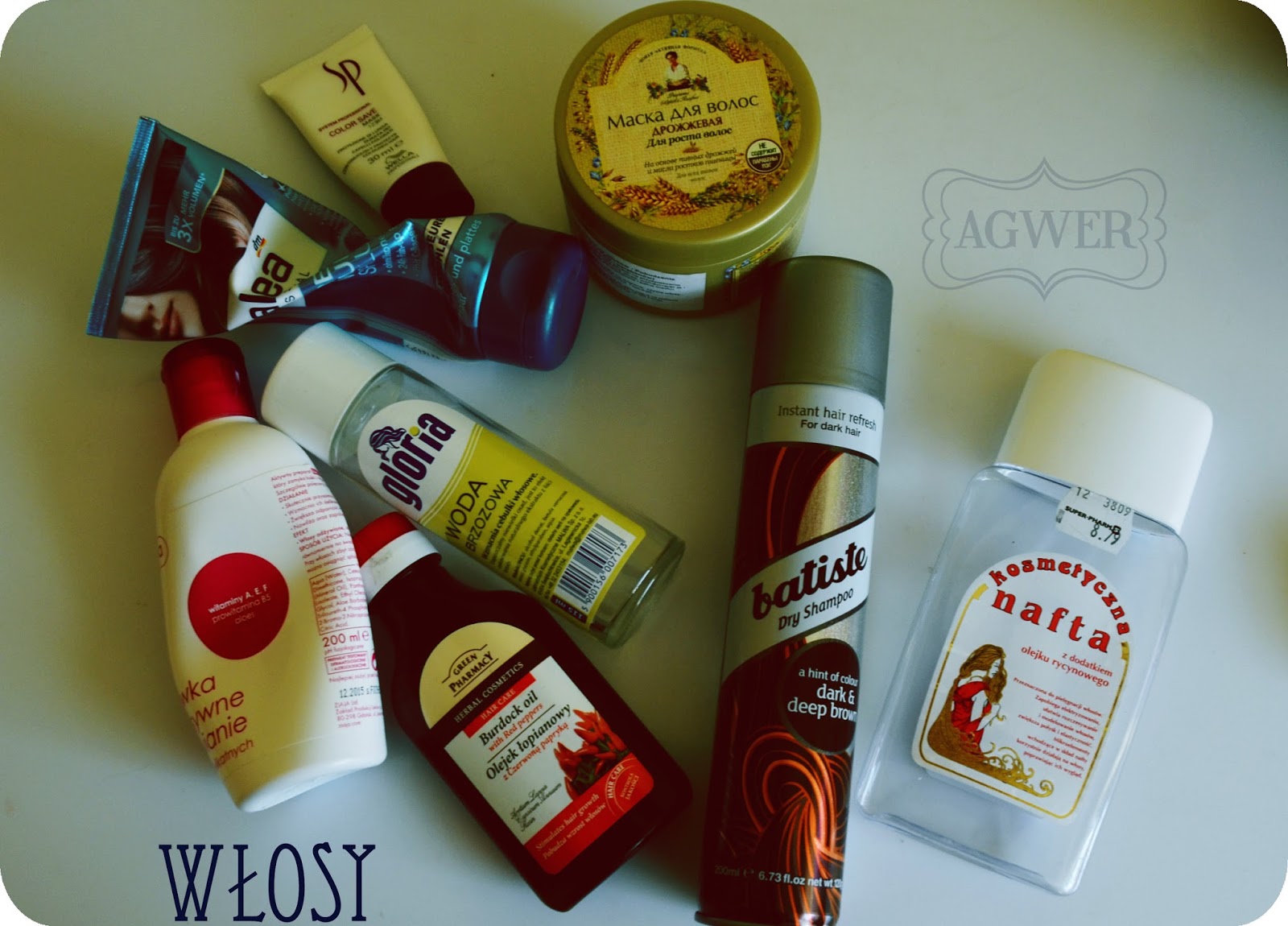 W projekcie denko miałam na każdym zdjęciu zaznaczyć czerwonym serduszkiem jaki kosmetyk będę chciała kupić podobnie, ale przypomniało mi się to dopiero po obrobieniu zdjęć. Zrobię więc to następnym razem. Przejdźmy jednak do rzeczy i oczywiście do najbardziej obszernej grupy zużytych kosmetyków – włosy. Zacznę od tych do któryh nie wrócę: nafta kosmetyczna – nie wykluczam jej użycia w ogóle, ale na pewno nie TEJ, którą widzicie na zdjęciu. Mocno podrażniła mi skalp, a musicie wiedzieć że on jest naprawdę odporny na różne specyfiki, tutaj jestem na nie i paszoł won! Następnym kosmetykiem jakiego nie kupię jest woda Brzozowa gloria, ponieważ nie zrobiła ona z moimi włosami kompletnie nic. Używałam 2 butelki przez ponad 2 miesiące dość regularnie i kompletnie nie przyspieszyła mi porostu, a na to liczyłam. Z całej reszty jestem zadowolona i to nawet bardzo. Drożdżowa odżywka od babcii Agafii sprawdziła się świetnie, podobnie jak próbka maski Well, odżywka z Ziaji oraz odżywka Volume Balea. Moje włosy na wszystkie zareagowały bardzo pozytywnie, a po użyciu rosyjskiej maski odwdzięczyły się pięknym blaskiem. Bez suchego szamponu z Batiste nie wyobrażam sobie życia, jestem bez niego kilka dni i już mi dokucza jego brak! O olejku łopianowym nie będę mówić, bo to mój must have i już o nim pisałam.