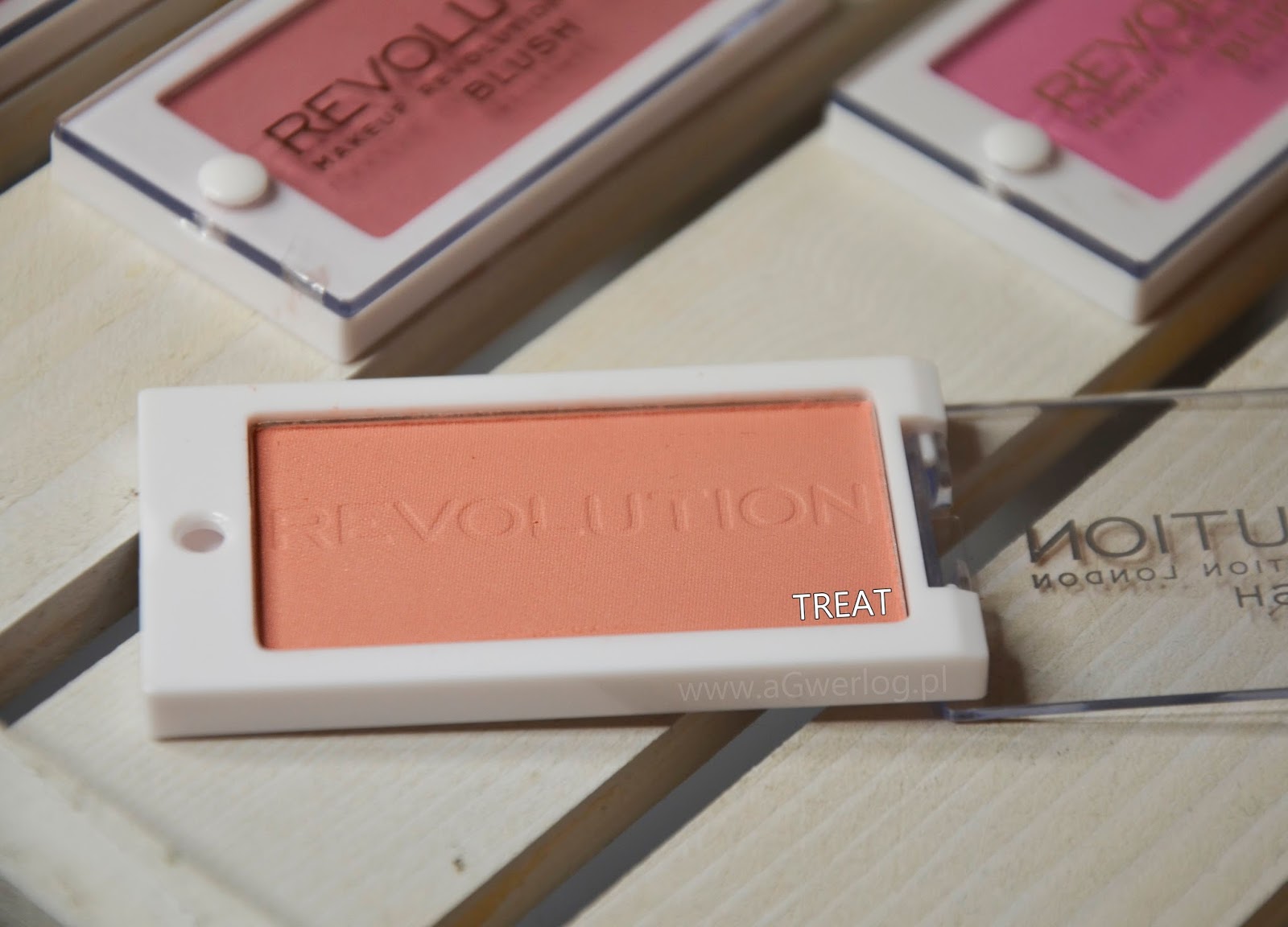 TREAT – mocno pomarańczowa brzoskwinia i choć początkowo byłam przerażona tym kolorem, tak teraz bardzo go lubię. Dobrze roztarty daje zdrowy efekt na buzi i fajnie ją ociepla. Świetnie wygląda w połączeniu z chłodnym bronzerem, np. tym z KOBO [KLIK].
